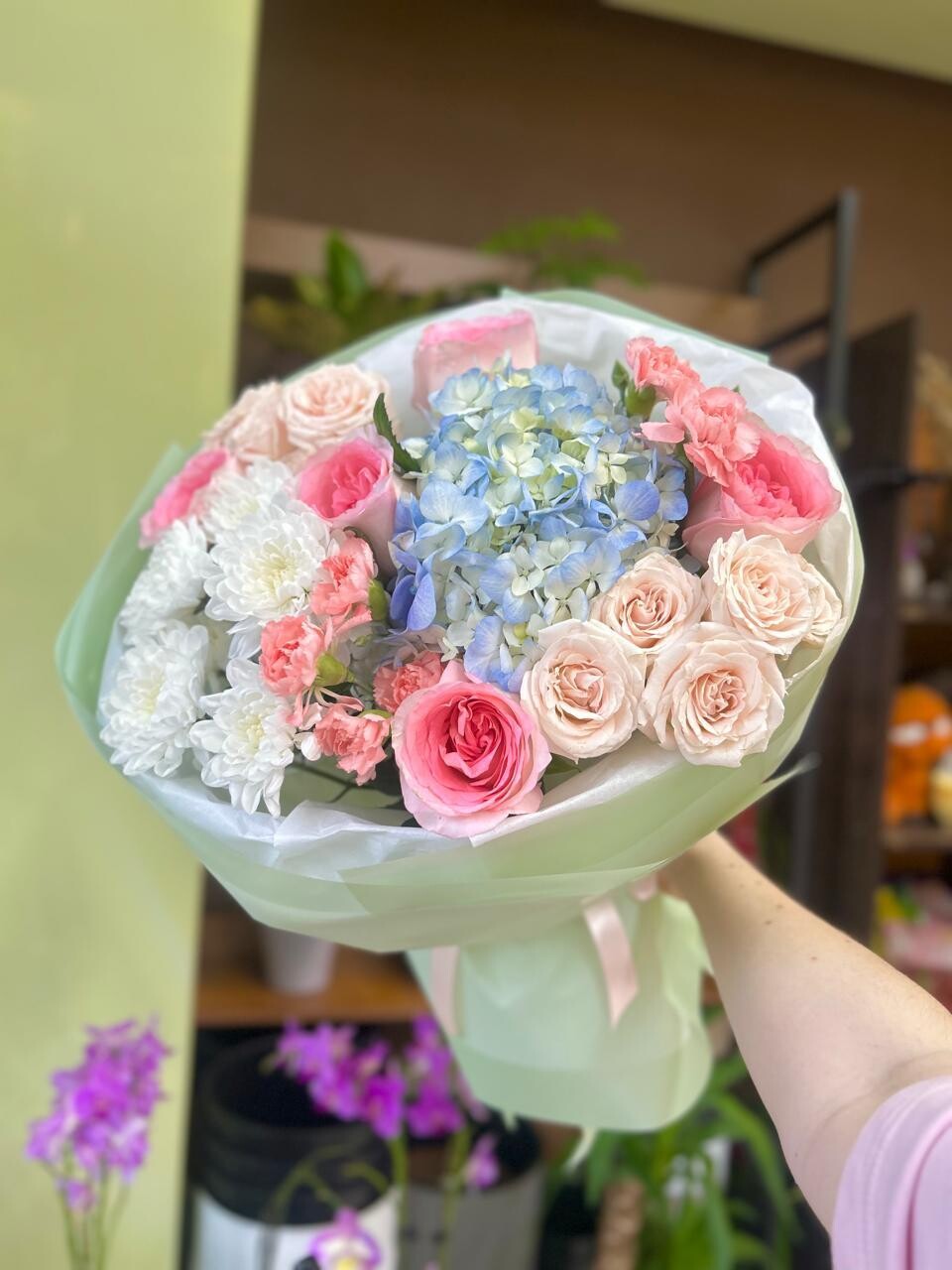 На сбор букета и доставку потребуется до 2-х часов в зависимости от сложности композиии