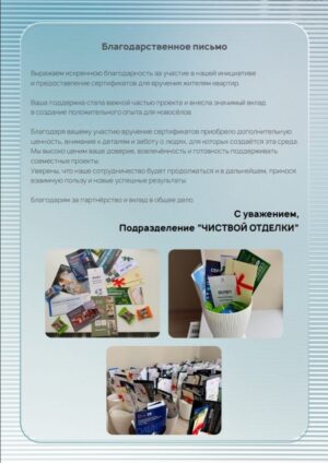 Мы рады началу сотрудничества с подразделением «Чистовая отделка» и благодарим команду за доверие к нашему цветочному салону. В рамках совместного проекта нами были подготовлены и предоставлены подарочные сертификаты, которые стали частью инициативы по созданию приятного и продуманного опыта для новосёлов. Для нас это новый и ценный формат корпоративного взаимодействия, в котором внимание к деталям и забота о людях имеют особое значение.