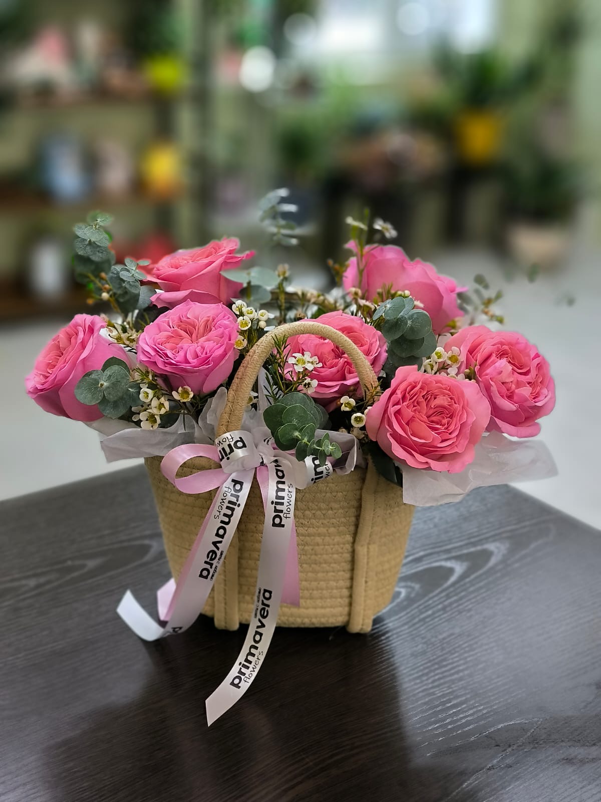 Корзинка с пышными розами насыщенного розового оттенка, дополненная эвкалиптом и воскфлауэром. Стильная, яркая и позитивная композиция, наполняющая пространство ароматом радости.