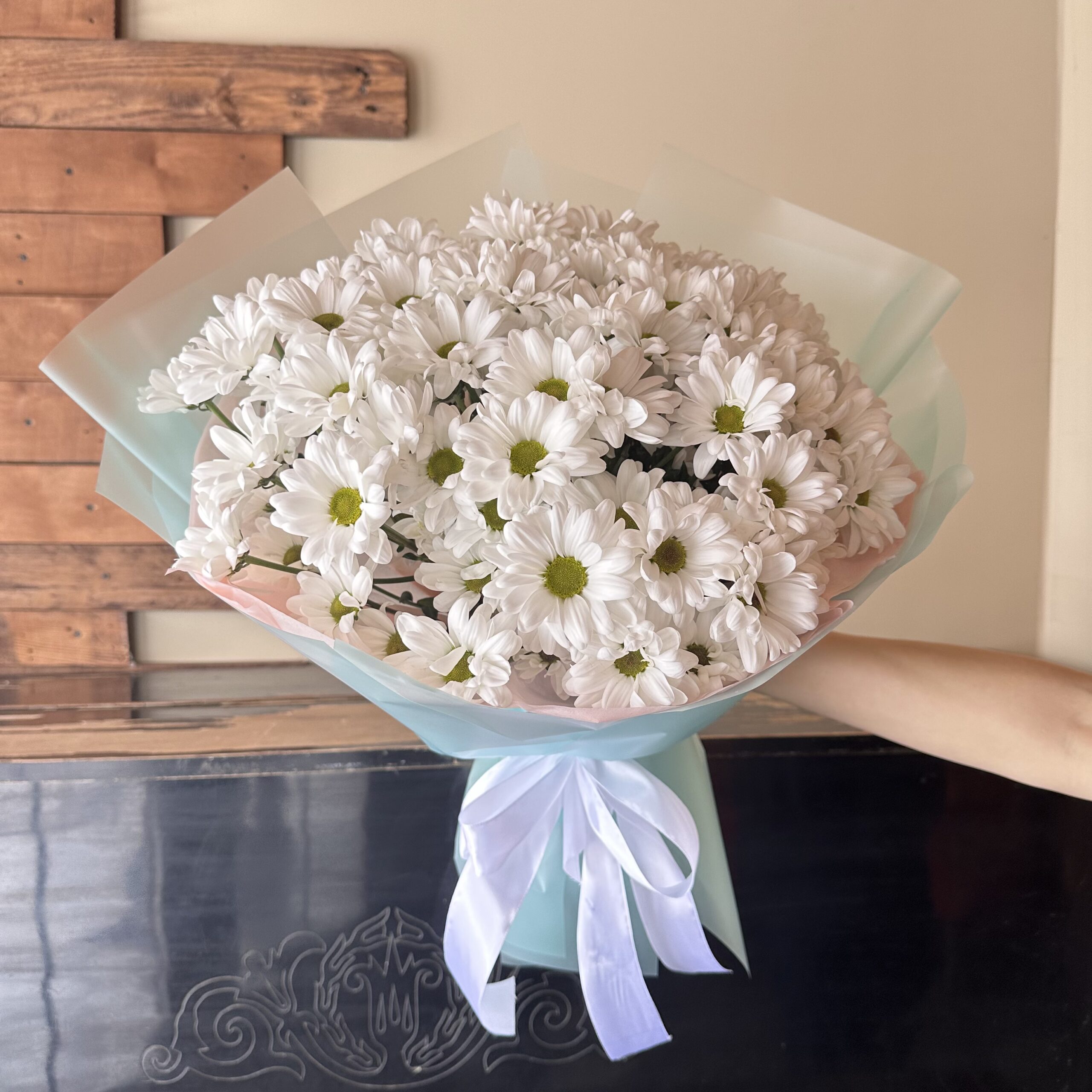 Букет «Чистая радость» — это лёгкость, свежесть и ощущение искреннего тепла. Белые ромашковые хризантемы создают объёмную, воздушную композицию, наполненную светом и спокойствием. Их лаконичная красота символизирует чистые намерения, заботу и душевную теплоту.